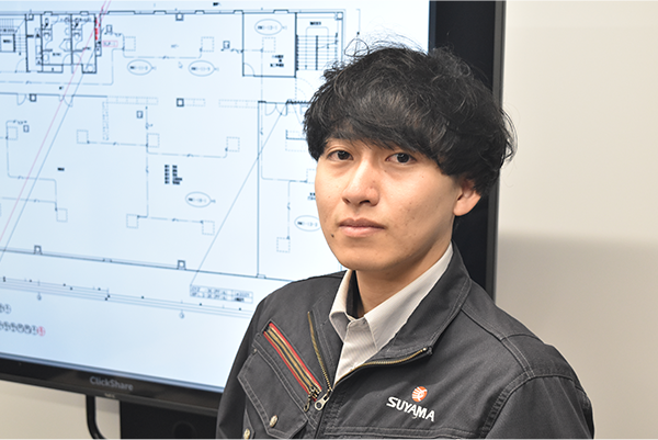 萩田 拓夢TAKUMU HAGITA設備設計を通じて環境に貢献したいという思いから須山建設に入社しました。現在は、業務に必要な基礎知識を学びながら仕事の進め方を少しずつ身につけている段階です。一日でも早く戦力となれるよう、自分にできることを積み重ねながら努力を続けていきます。