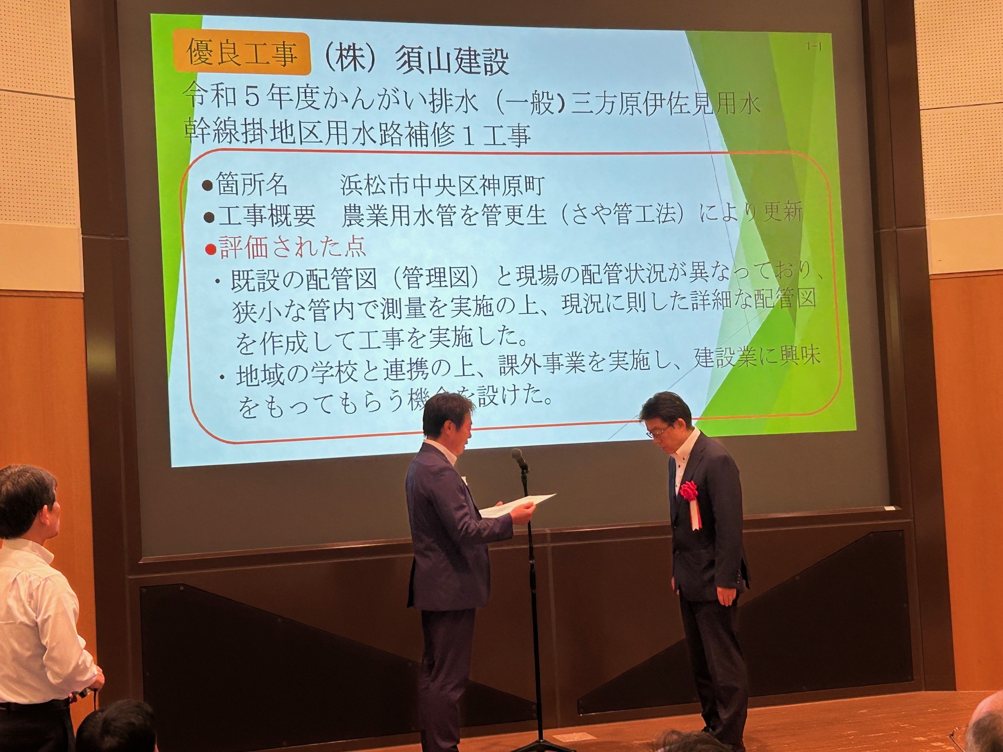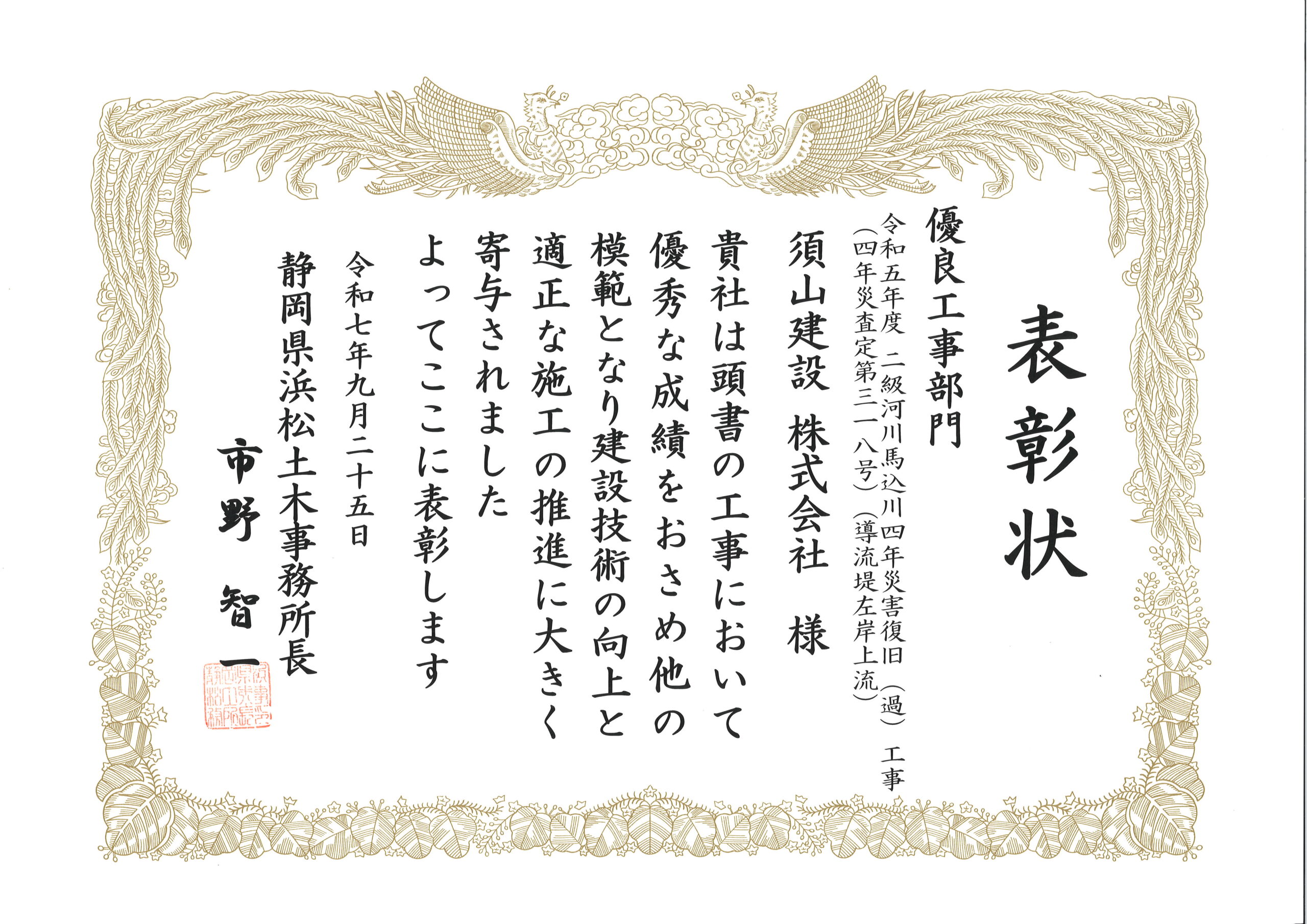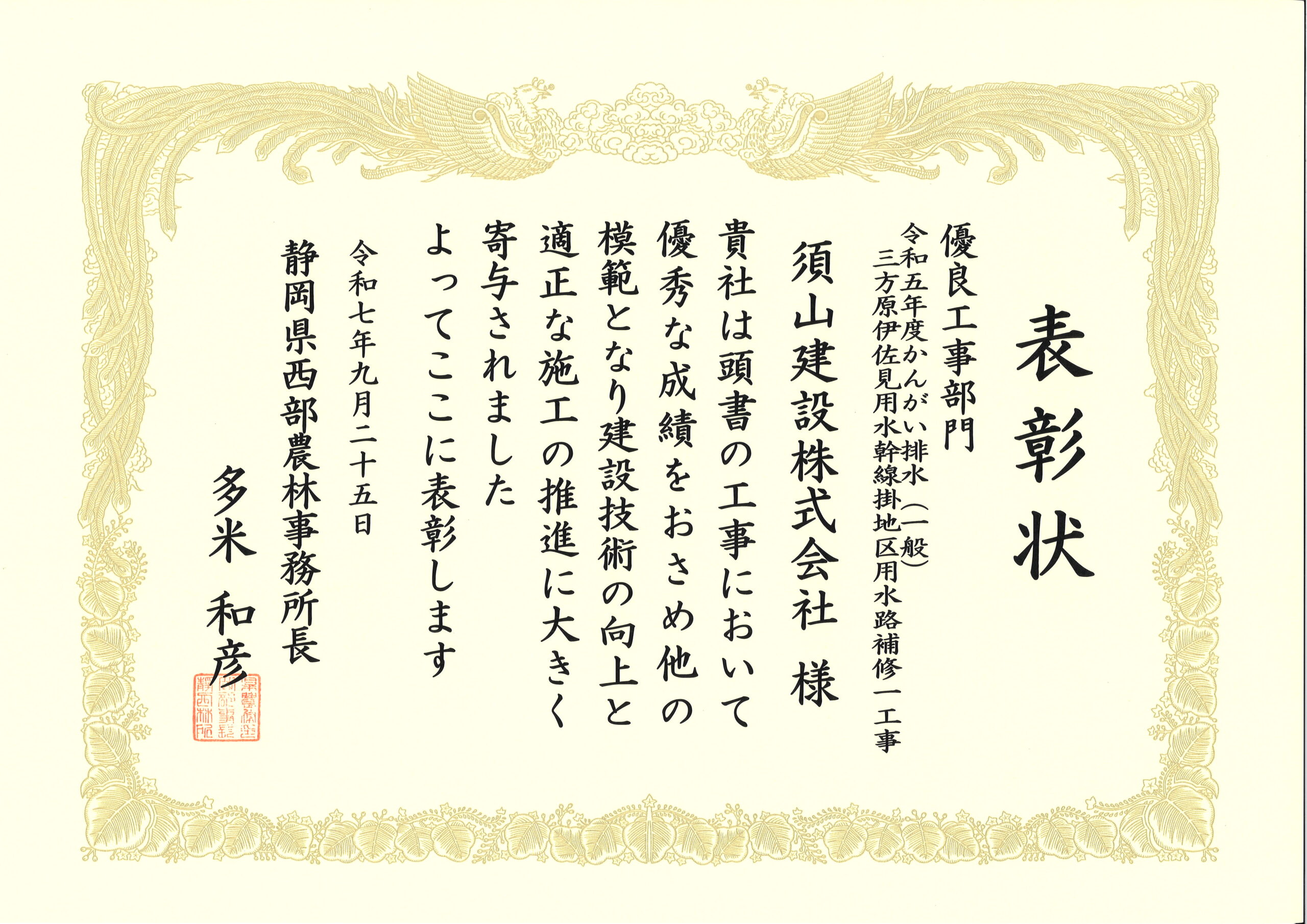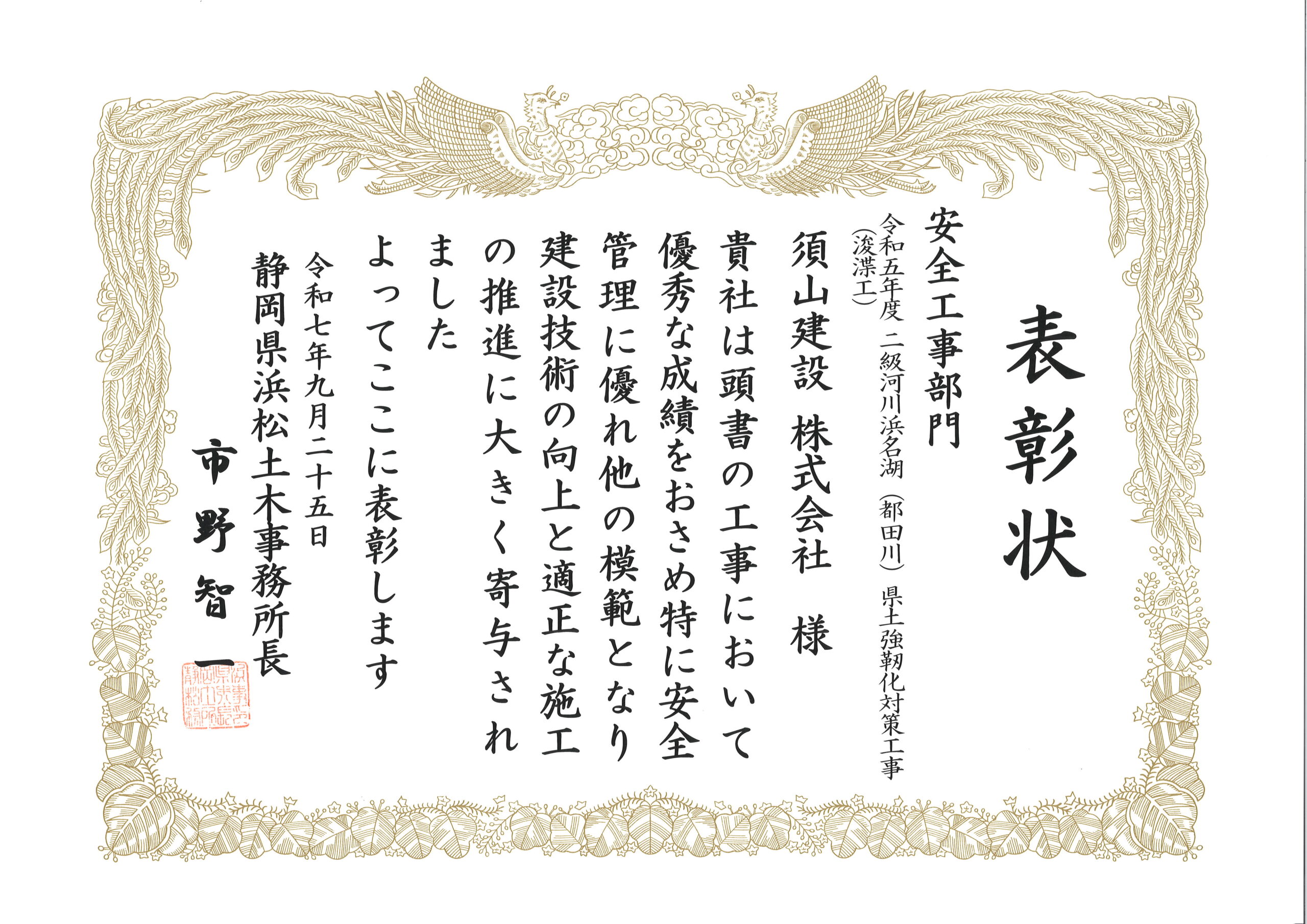 優良工事施工者が決定され、須山建設では「優良工事部門」、「安全工事部門」を受賞いたしました。