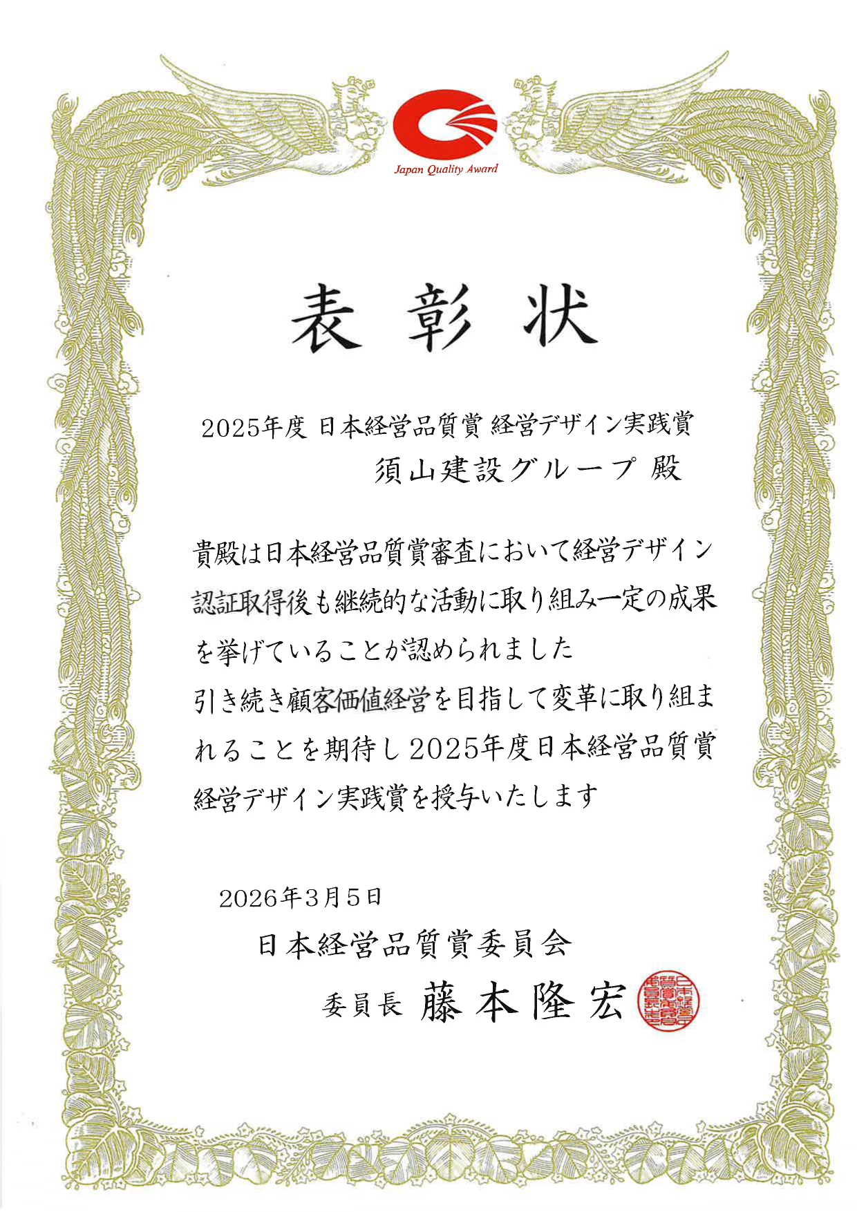 この度、須山建設グループは日本生産性本部 経営品質協議会が主催する、
